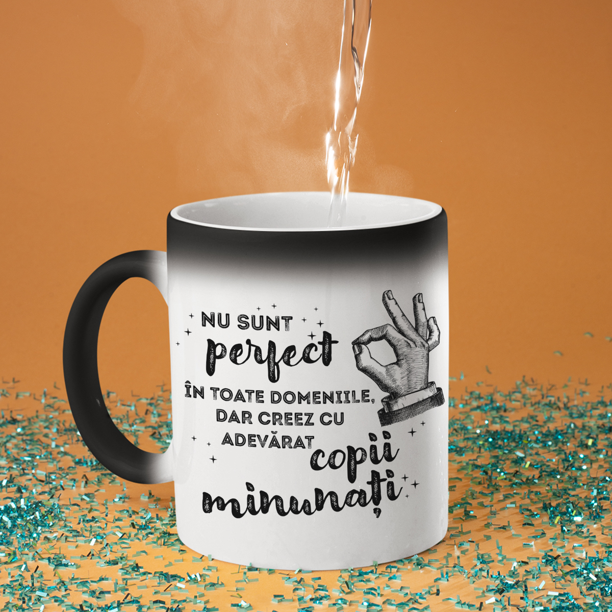 - Cana magică - nu degeaba se numește magică! La prima vedere, este o simplă cană neagră, dar atunci când se toarnă apă fierbinte în ea, aceasta devine albă, iar inscripția ascunsă este dezvăluită. Este o adevărată surpriză și un mic miracol pentru fiecare zi!