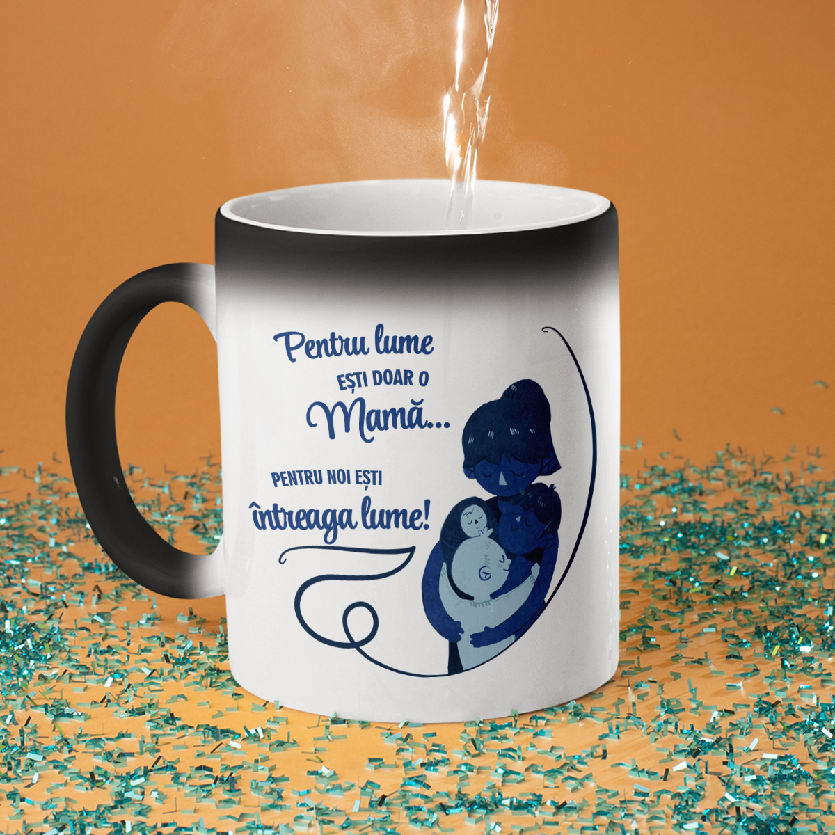 Inscripția este plasată pe ambele părți ale cănii, astfel încât va fi vizibilă atât pentru dvs. cât și pentru toți cei din jur.