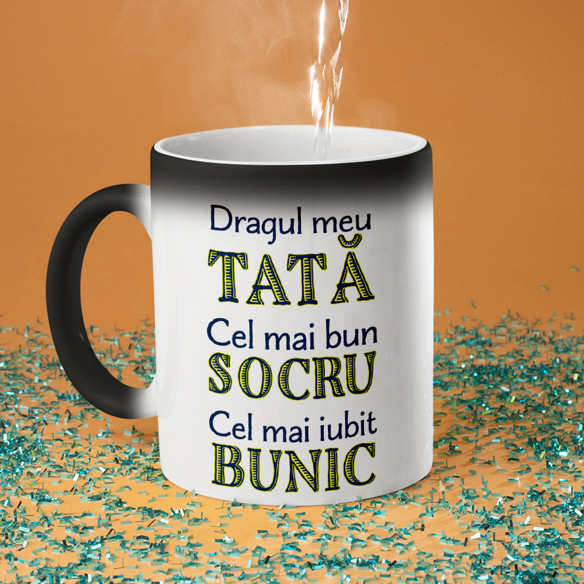 - Cana magică - nu degeaba se numește magică! La prima vedere, este o simplă cană neagră, dar atunci când se toarnă apă fierbinte în ea, aceasta devine albă, iar inscripția ascunsă este dezvăluită. Este o adevărată surpriză și un mic miracol pentru fiecare zi!