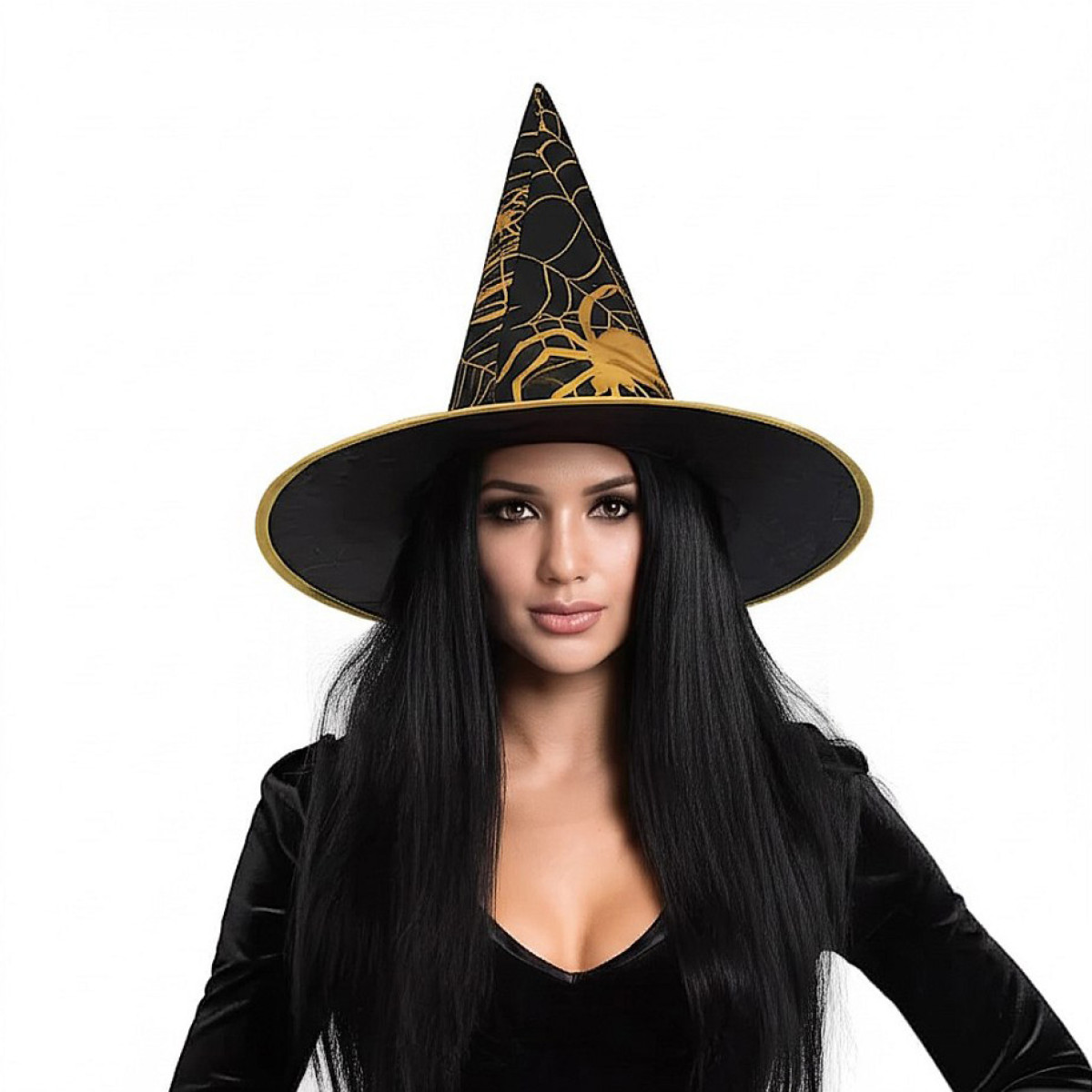 Pălăria de vrăjitoare este un accesoriu indispensabil pentru Halloween, carnaval sau o petrecere tematică. Pălăria neagră, ascuțită, este decorată cu pânze de păianjen aurii și un păianjen, dând look-ului un aer unic și mistic.