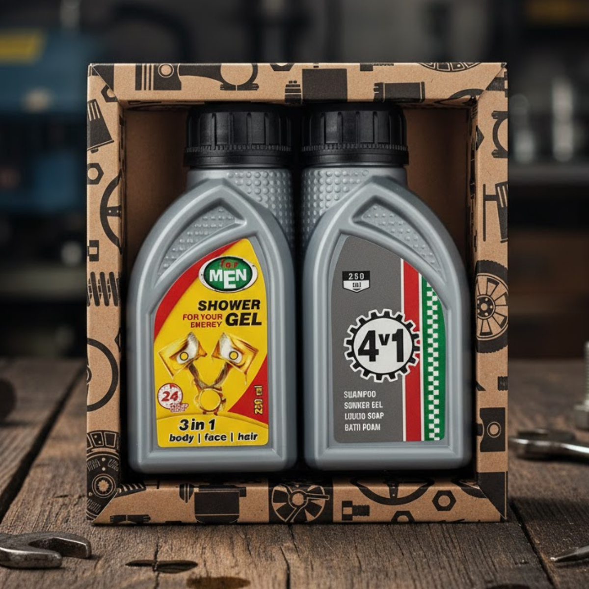 Ambalajul gelului de duș și al șamponului seamănă cu sticlele de ulei pentru mașini, făcând acest set perfect pentru bărbații cărora le place să aibă grijă de corpul lor și care apreciază cadourile amuzante și practice.